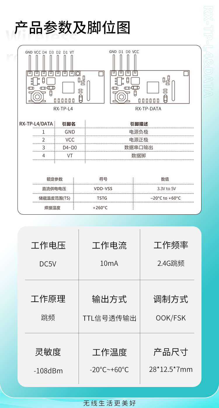 RX-TP-L4/DATA是一款低功耗2.4G双向反馈跳频接收模块,抗干扰性强,不受同频干扰。主要麻豆视频APP免费版下载于麻豆TV在线观看接收领域,与其他的接收模块比较,具有价格便宜、性能好、稳定等特点。