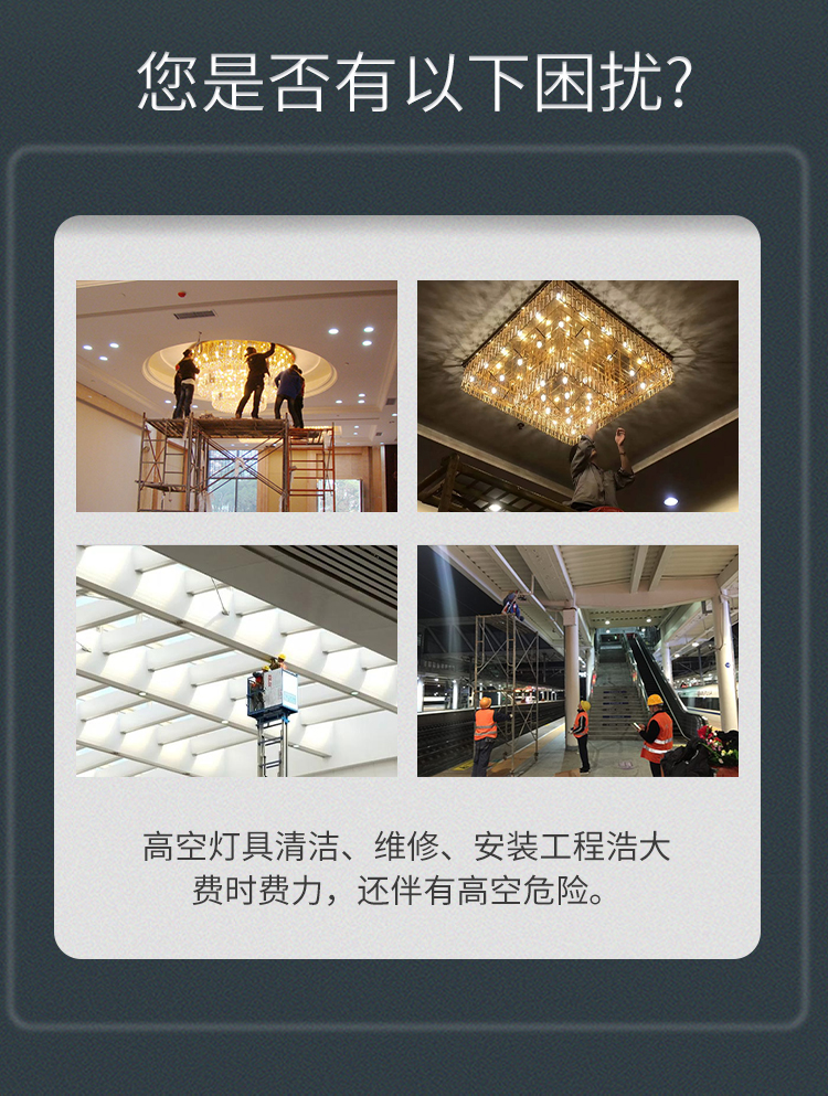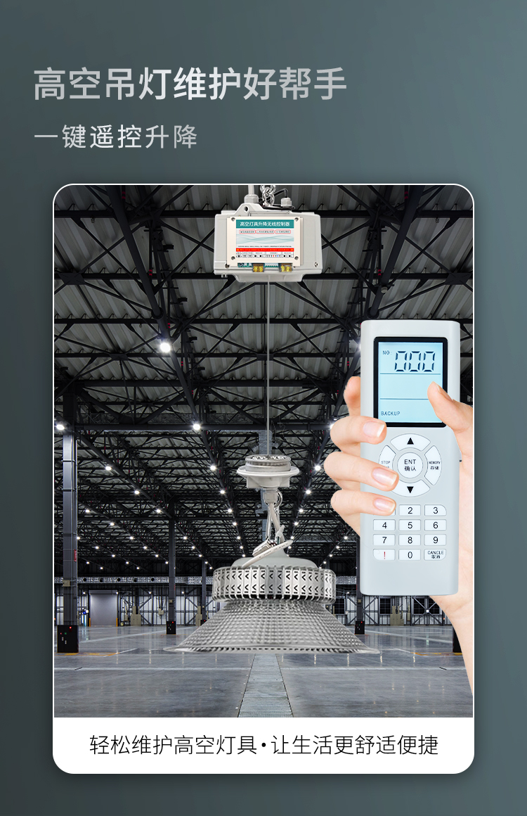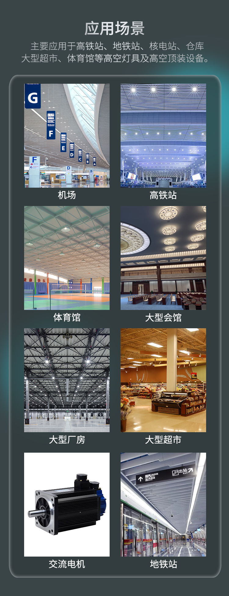 适用于机场、高铁站、地铁站、仓库、大型超市、体育馆等高空灯具及高空顶装设备。