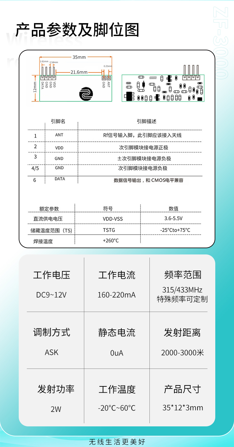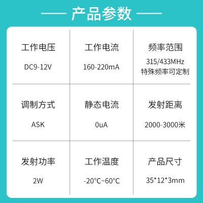 10.天线长度:24cm(315MHz),18cm(433.92MHz)